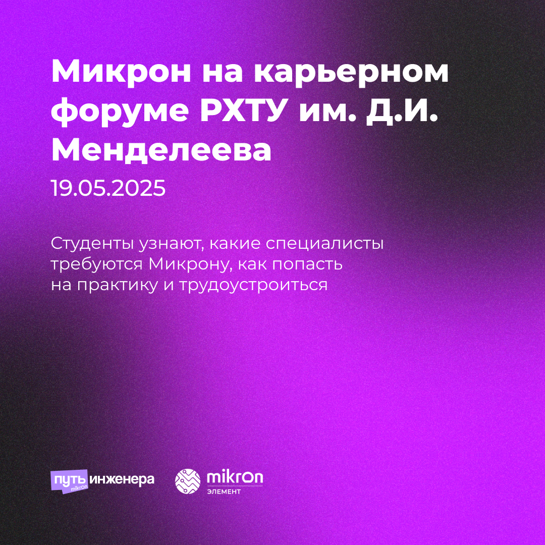 19 мая 2025 года Микрон, крупнейший производитель российской микроэлектроники (входит в группу компаний «Элемент», ELMT), резидент ОЭЗ «Технополис Москва», представит студентам траектории построения карьеры на заводе и расскажет о работе предприятия на карьерном форуме «Большая химия большой страны» в РХТУ им Д.И. Менделеева.
